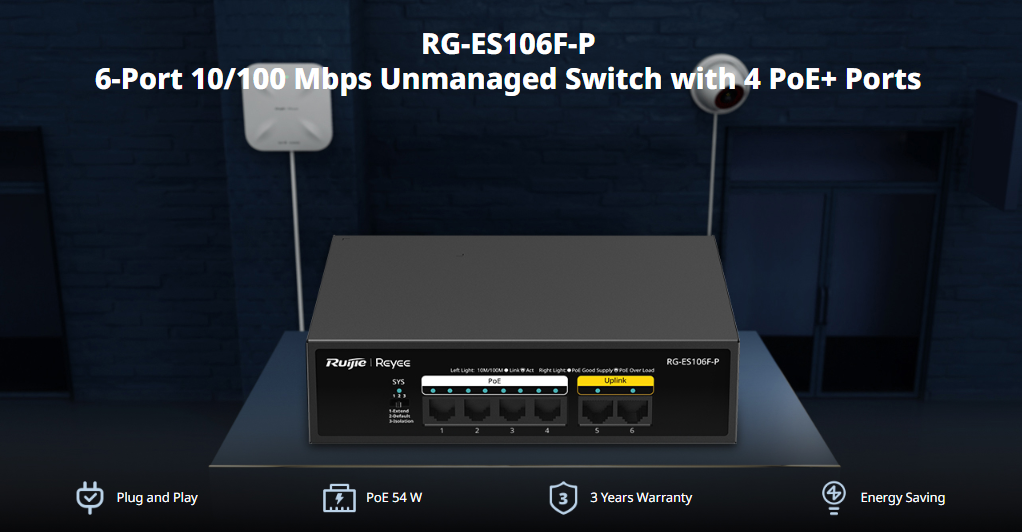 FICHA TÉCNICA: https://reyee.ruijie.com/en-global/products/reyee-switch/unmanaged-switch/rg-es106f-p/